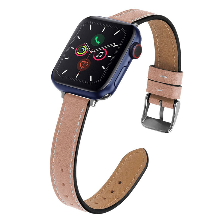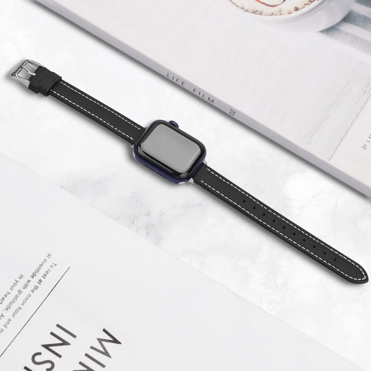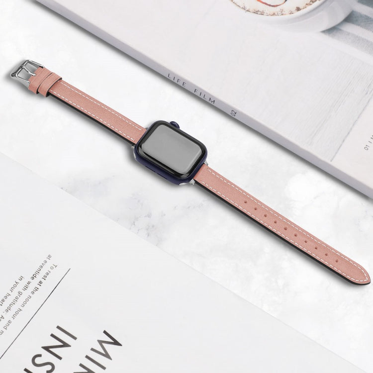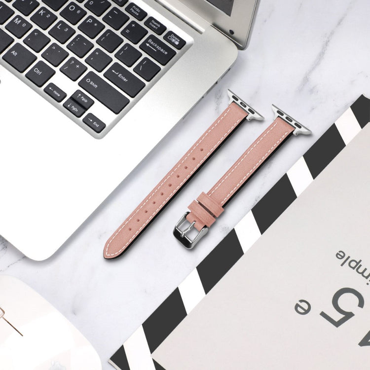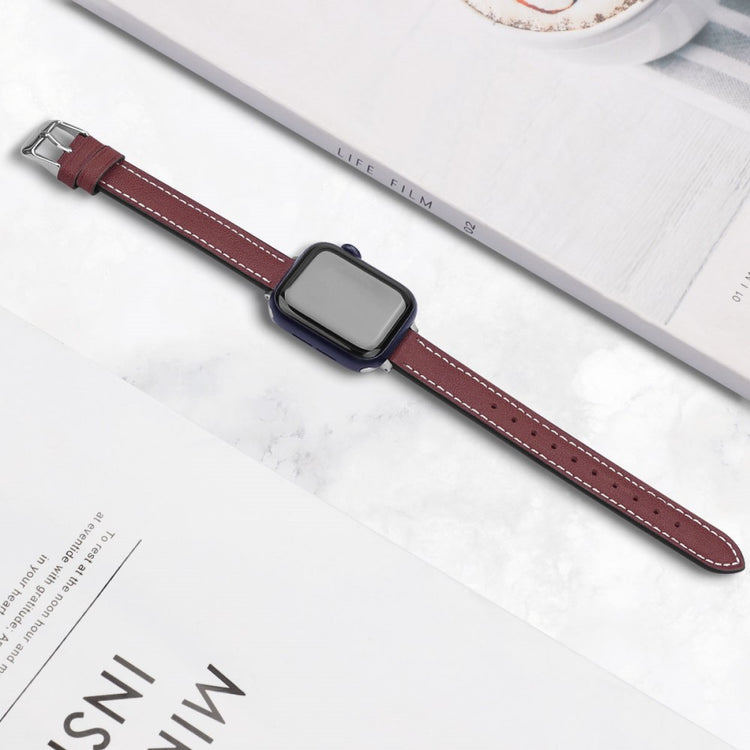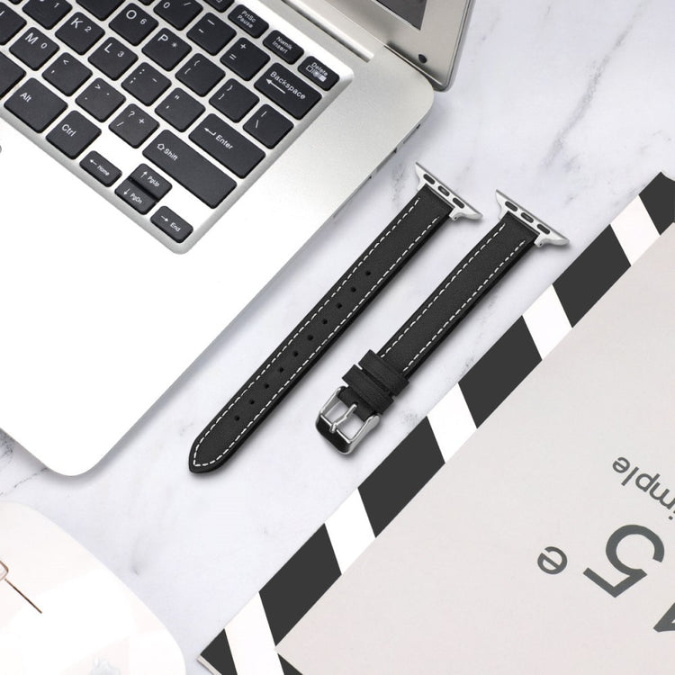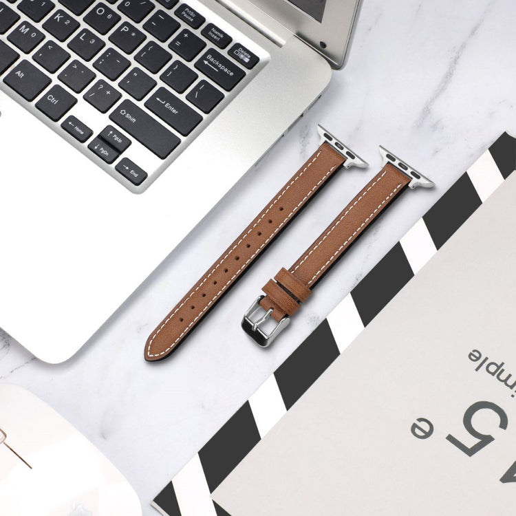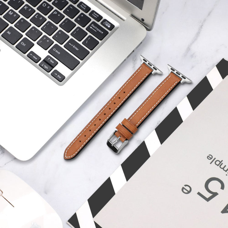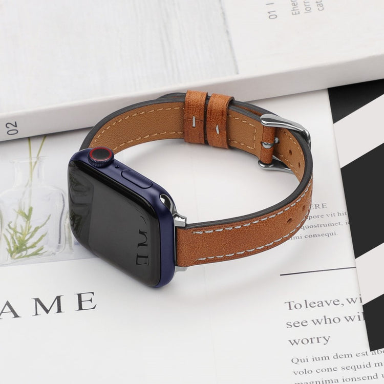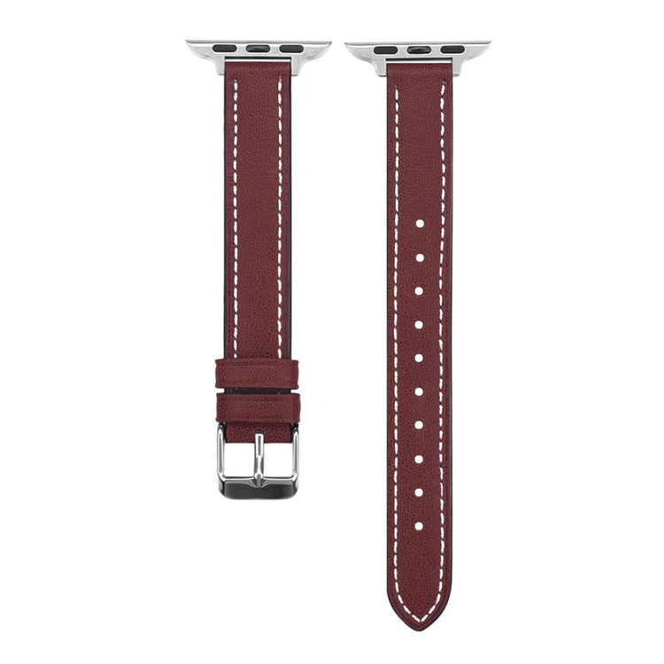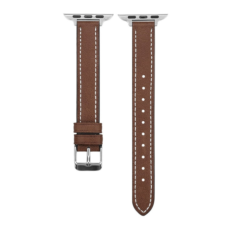 Dieses schmale Uhrenarmband aus echtem Leder bietet einen retro Look und hohen Tragekomfort für Ihre Apple Watch. Die Nähte verleihen dem Armband einen klassischen und robusten Stil. Dank der Metallschnalle lässt sich die Größe einfach anpassen. Die feine Ledertextur sorgt für ein angenehmes Gefühl am Handgelenk.