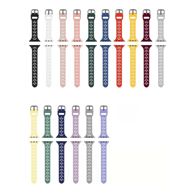 Dieses Silikon-Sportarmband ist kompatibel mit der Apple Watch Series 9 / 8 / 7 41mm / 6 / 5 / 4 / SE (2023) / SE (2022) / SE 40mm / 3 / 2 / 1 38mm. Es besteht aus hochwertigem Silikon und bietet einen angenehmen Tragekomfort. Das Material ist hautfreundlich und antiallergisch. Das Armband ist mit ausgehöhlten Katzenpfoten verziert und verleiht Ihrer Uhr einen besonderen Look.