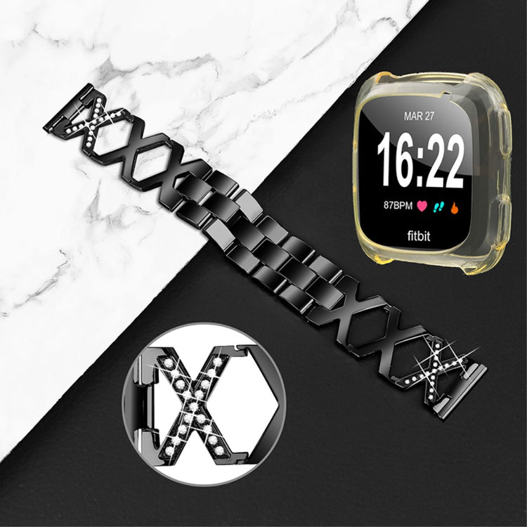 Verleihen Sie Ihrem Fitbit Versa, Versa 2, Versa Lite oder Versa SE mit diesem X-förmigen Uhrenarmband und der transparenten TPU-Hülle einen Hauch von Eleganz und Glamour! Hergestellt aus hochwertigem 304 Edelstahl, ist das Armband stark und langlebig, sodass es den Anforderungen des Alltags mühelos standhält. Die chice Gestaltung mit exquisiten Bling-Rhinestones lässt es wie funkelnde Sterne an Ihrem Handgelenk erscheinen und verleiht jedem Outfit einen eleganten Akzent. Das Anpassen der Größe ist einfach und unkompliziert – verwenden Sie einfach Ihren Fingernagel, um die Verschlüsse zu öffnen, ganz ohne Werkzeug, und stellen Sie die passende Größe für Ihr Handgelenk ein. Zudem schützt die mitgelieferte anti-scratch Uhrenhülle Ihr Gerät vor Stößen, Kratzern und anderen Schäden. Ideal für Handgelenke mit einem Umfang von 5.5 bis 8.1 Zoll, bietet dieses Zubehör sowohl Stil als auch Funktionalität. Entscheiden Sie sich für dieses stilvolle Upgrade und gönnen Sie Ihrem Smartwatch-Zubehör das besondere Etwas!