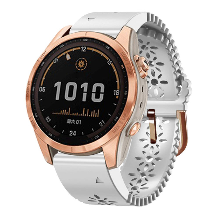 Entscheiden Sie sich für das Hollow-out Flower Pattern Silicone Watch Band als ideales Zubehör für Ihre Garmin Fenix 7S, 6S Pro, 5S Plus oder Instinct 2S! Hergestellt aus öko-freundlichem Silikonmaterial, bietet es zahlreiche Vorteile für den aktiven Lebensstil. Das Band ist wasserdicht und schweißfest, sodass es in jeder Situation eingesetzt werden kann, sei es beim Sport oder im Alltag. Die hollow out flower pattern Gestaltung verleiht Ihrem Smartwatch-Band einen stilvollen Akzent, der Ihre persönliche Note unterstreicht. Zudem ist die Größe individuell einstellbar, was höchsten Tragekomfort garantiert. Die klassische Nadelverschluss-System ermöglicht ein einfaches An- und Ablegen des Bands. Mit verschiedenen Optionen erfüllt dieses Armband unterschiedliche Stilbedürfnisse und ist die perfekte Ersatzlösung für Ihr altes, defektes Band. Gönnen Sie Ihrer Uhr das Upgrade, das sie verdient – für einen Hauch von Style und Funktionalität!