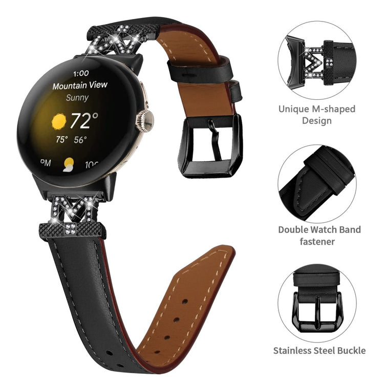 Entscheiden Sie sich für dieses Armband für die Google Pixel Watch / Pixel Watch 2, da es aus hochwertigem, echtem Rindsleder gefertigt ist, was Ihnen ein angenehmes Tragegefühl bietet. Es lässt sich mühelos mit Ihrer täglichen Garderobe kombinieren und verleiht Ihrem Smartwatch einen eleganten Look mit dem M-förmigen, strassverzierten Detail. Dank des mehrfach einstellbaren Designs können Sie die Größe ganz nach Ihren Bedürfnissen anpassen, was zusätzlichen Komfort gewährleistet. Die strapazierfähige Edelstahl-Schnalle sorgt für Langlebigkeit und Sicherheit, sodass Sie sich keine Sorgen um Beschädigungen machen müssen. Dieses Armband ist die perfekte Ersatzlösung für Ihr altes oder defektes Armband und eignet sich ideal für Arbeits-, Freizeit- und andere Alltagsanlässe – sowohl für Frauen als auch für Männer. Gönnen Sie sich ein Upgrade und heben Sie Ihren Stil auf die nächste Stufe!
