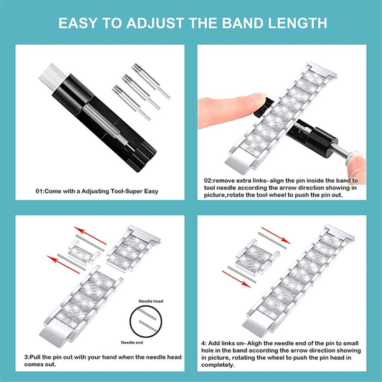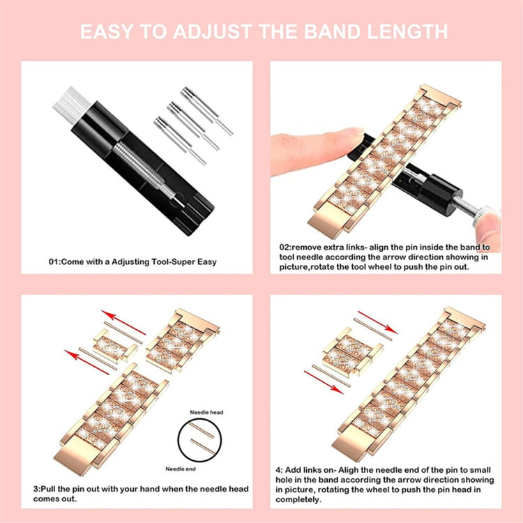 Das Uhrenarmband aus hochwertigem Legierungsmaterial überzeugt durch seine feine Verarbeitung und eine elegante Rhinestone-Dekoration, die jedem Outfit einen stilvollen Akzent verleiht. Dank seiner robusten und hautfreundlichen Oberfläche ist es nicht nur angenehm zu tragen, sondern auch langlebig und antikorrosiv. Mit einem Werkzeugset zur einfachen Installation ist der Austausch des Armbands ein Kinderspiel und macht Sie zum Blickfang bei jeder Gelegenheit.