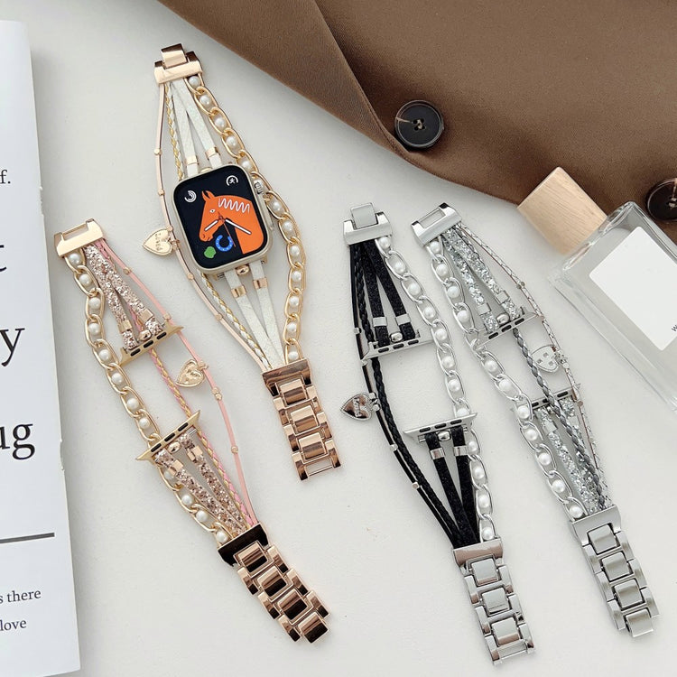 Das hochwertige Armband für die Smartwatch ist aus metall, leder und perle gefertigt und besticht durch modische, herzförmige Dekorationen. Jedes Armband wird von erfahrenen Handwerkern hergestellt und sorgt dank seiner robusten und glatten Oberfläche für komfortables Tragen. Die langlebige Schnallentechnologie bietet zusätzlichen Schutz für Ihre Uhr und eignet sich besonders gut für formelle Anlässe wie Termine, Partys und Reisen.