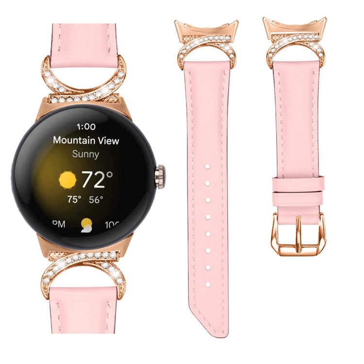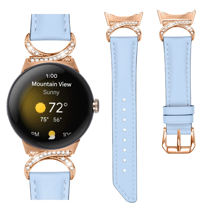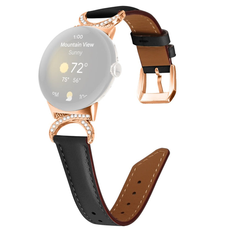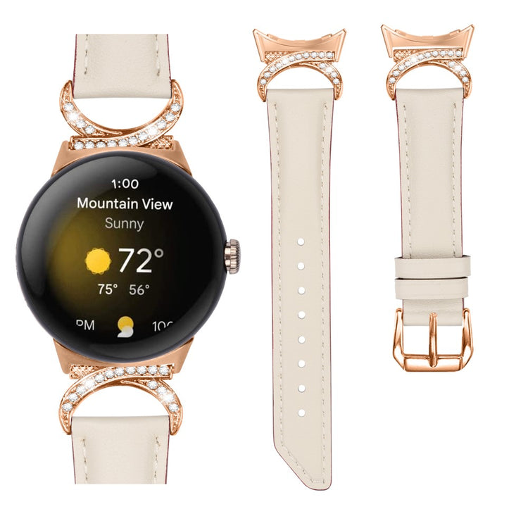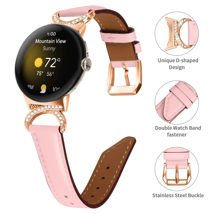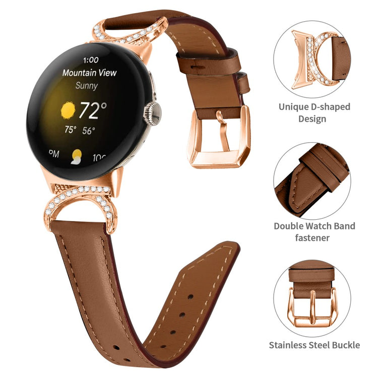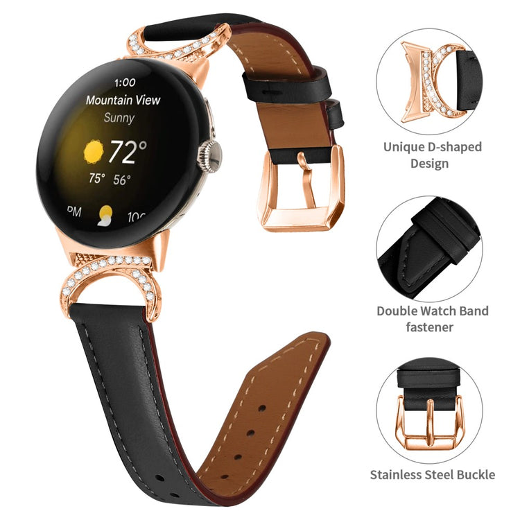 Entscheiden Sie sich für unser hochwertiges Armband für die Google Pixel Watch 2 / Pixel Watch, um Ihrem Alltagslook das gewisse Etwas zu verleihen. Dieses Armband ist aus Rindsleder gefertigt und bietet exquisite Verarbeitung, die sowohl weich als auch bequem ist. Der Rhinestone-Dekor D-förmige Metallverbinder macht das Armband nicht nur eleganter, sondern verleiht auch einen stilvollen Akzent, der alle Blicke auf sich zieht. Mit der robusten Edelstahleschließe und dem durchdachten Design der zahlreichen Löcher lässt sich die Größe mühelos anpassen, sodass Sie stets den perfekten Sitz genießen können. Der schicke, schräg gestaltete Schluss des Armbands sorgt für ein noch schöneres Erscheinungsbild. Es ist die ideale Ersatzlösung für Ihr altes, beschädigtes Armband und macht Ihre Smartwatch zum begehrten Accessoire, das Ihren persönlichen Stil unterstreicht.