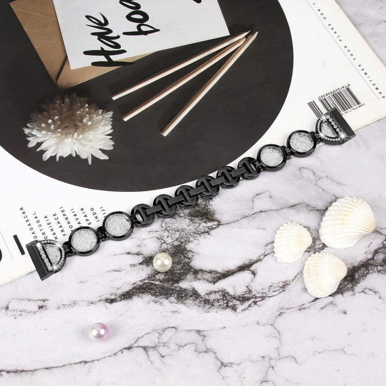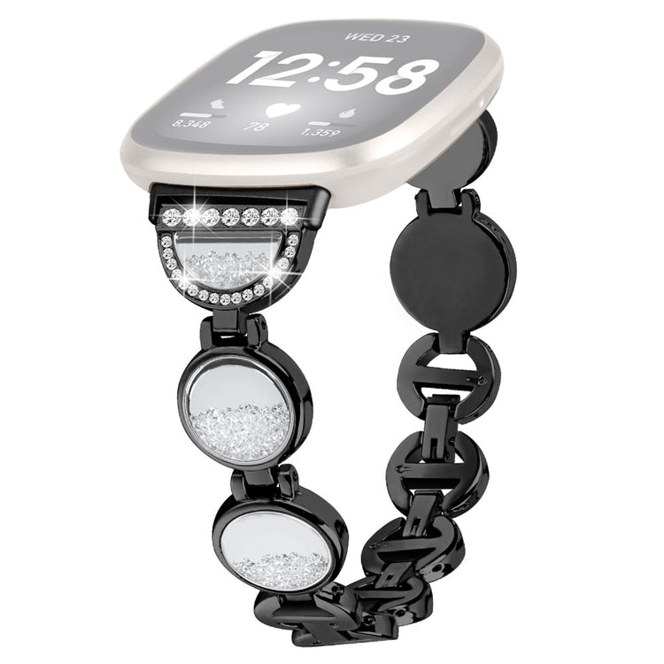 Dieses Armband für Fitbit Versa 4 / Sense 2 verleiht Ihrer Smartwatch einen Hauch von Glamour. Hergestellt aus hochwertigem Metall, ist es mit funkelnden Strasssteinen verziert und mit einem Treibsand-Effekt kombiniert, der für einen modischen und eleganten Look sorgt.