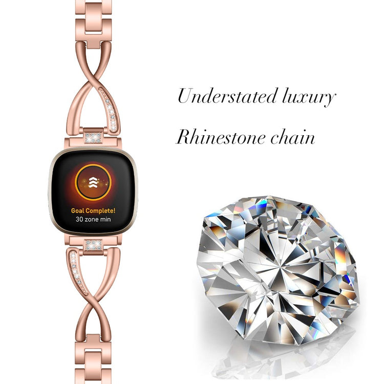 Dieses Uhrenarmband verleiht Ihrer Fitbit Versa 4 / Sense 2 einen Hauch von Glamour. Hergestellt aus hochwertiger Zinklegierung, ist es robust und langlebig. Die exzellente Verarbeitung sorgt für ein geschmeidiges und angenehmes Tragegefühl. Das X-förmige Design mit Strasssteinbesatz verleiht Ihrer Smartwatch einen stilvollen und eleganten Look. Personalisieren Sie Ihre Smartwatch mit diesem modischen Armband.