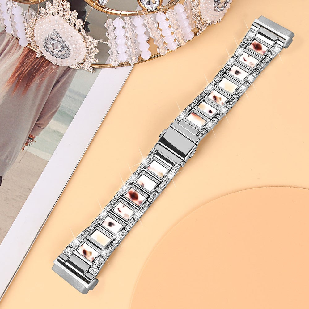 Dieses Armband für Fitbit Versa 4 / Sense 2 verleiht Ihrer Smartwatch einen einzigartigen und stilvollen Look. Hergestellt aus langlebigem Edelstahl mit Resin-Blöcken, besticht es durch ein kreatives Design und glänzende Strasssteine, die für einen Hauch von Glamour sorgen.