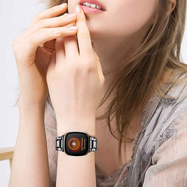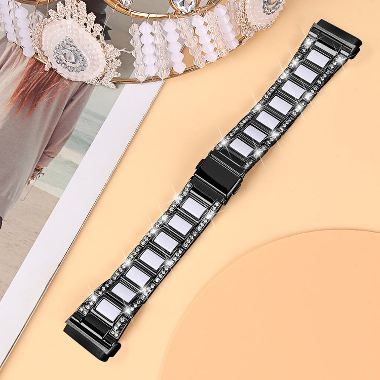 Dieses Armband für Fitbit Versa 4 / Sense 2 verbindet langlebigen Edelstahl mit eleganten Resin-Elementen für einen kreativen und stilvollen Look. Funkelnde Strasssteine verleihen Ihrer Smartwatch eine einzigartige und persönliche Note.