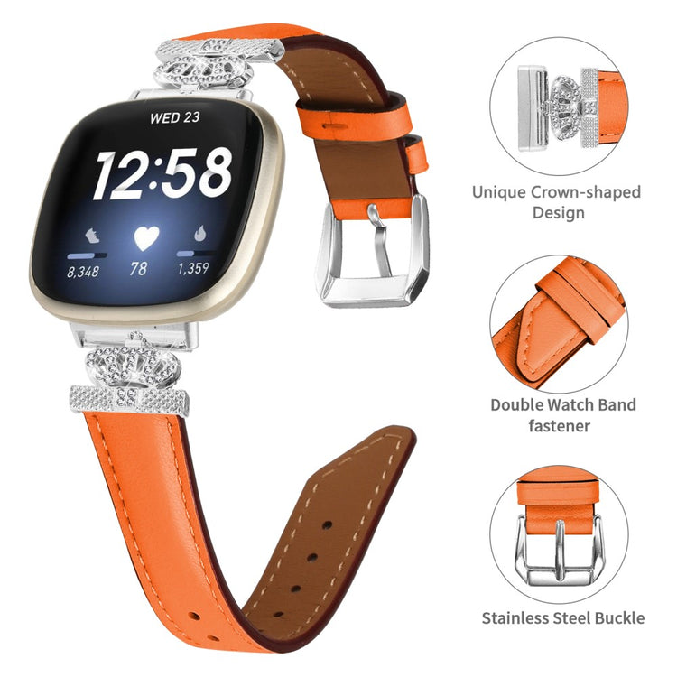 Entscheiden Sie sich für das Uhrenband mit Krone und silberner Schnalle für die Fitbit Versa 3 / 4 / Sense 2 und erleben Sie die perfekte Kombination aus Stil und Funktionalität. Hergestellt aus hochwertigem, echtem Rinderleder, bietet dieses Band nicht nur einen angenehmen Tragekomfort, sondern lässt sich auch mühelos mit Ihrer alltäglichen Kleidung kombinieren. Das elegante Kronen-Design und die funkelnden Rhinestones verleihen Ihrer Smartwatch eine besondere Note und unterstreichen Ihren persönlichen Stil. Dank des durchdachten Mehrfachloch-Designs können Sie die Größe des Uhrenbands ganz einfach anpassen, sodass es immer perfekt sitzt. Die verwendete hochwertige edle Stahl-Schnalle sorgt für die Langlebigkeit des Bandes, damit Sie lange Freude daran haben. Egal ob bei der Arbeit, in der Freizeit oder bei anderen täglichen Anlässen – dieses Uhrenband ist der ideale Ersatz für Ihr altes, defektes Band und verleiht Ihrer Smartwatch ein neues, stilvolles Erscheinungsbild.