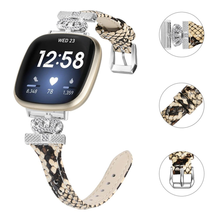 Entscheiden Sie sich für das Armband aus echtem Rindsleder für den Fitbit Versa 3 / 4 / Sense / Sense 2, um Ihrem Smartwatch das gewisse Etwas zu verleihen. Dieses Armband bietet nicht nur einen hohen Tragekomfort, sondern lässt sich auch mühelos mit Ihrem Alltagsoutfit kombinieren. Das elegante, kroneförmige Verbindungsstück und das glänzende Design mit Rhinestones machen Ihre Smartwatch zu einem echten Blickfang. Dank des durchdachten Vielloch-Designs können Sie die Größe des Armbands problemlos anpassen, was es zu einer praktischen Wahl für jeden Handgelenks - und einen idealen Ersatz für Ihr altes oder beschädigtes Armband macht. Hergestellt mit einer strapazierfähigen edelstahl-schnalle, ist dieses Armband nicht nur stilvoll, sondern auch langlebig. Es eignet sich perfekt für arbeitliche, freizeitliche oder andere tägliche Anlässe, sowohl für Frauen als auch für Männer. Gönnen Sie sich oder einem lieben Menschen dieses stilvolle Accessoire und werten Sie Ihr Trageerlebnis auf!